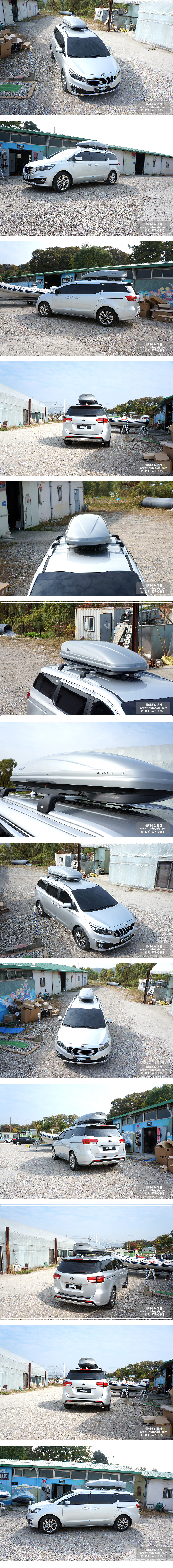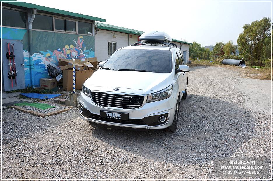 기아 올뉴카니발 차량과 툴레 루프박스 모션800실버유광 모델입니다.